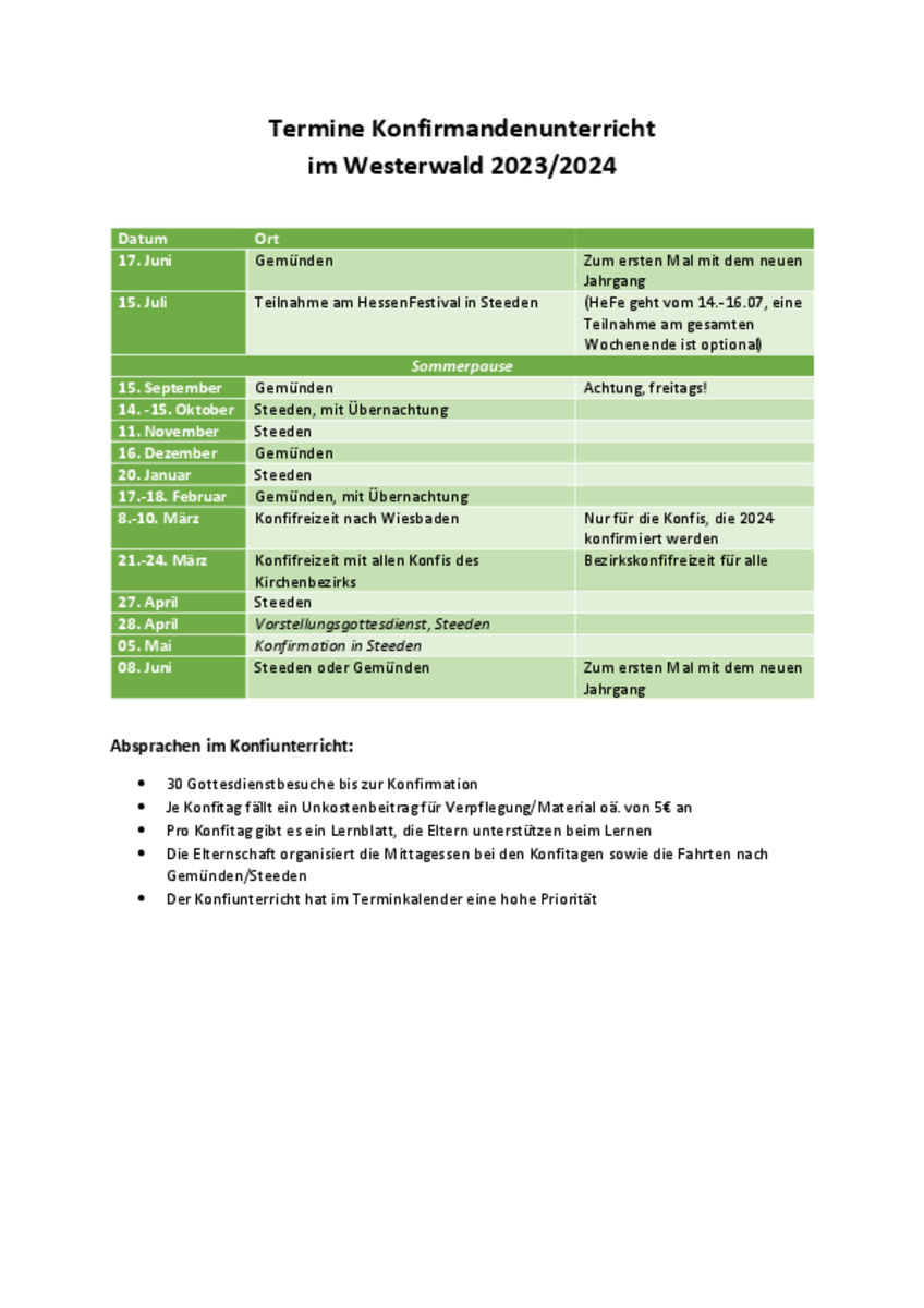 Mit diesen und anderen Fragen - den Kernthemen christlichen Glaubens - beschäftigen sich unsere Konfirmandinnen und Konfirmanden. Der Unterricht erstreckt sich in der Regel über zwei Jahre und findet einmal im Monat samstags statt. Die Gruppe setzt sich aus Jugendlichen der vier Westerwald-Gemeinden (Allendorf/Ulm, Gemünden, Limburg und Steeden) zusammen. Nach einer kurzen Start-Phase haben Haupt- und Vorkonfis gemeinsam Unterricht. Neben den normalen Konfistunden gehören drei Konfi-Freizeiten und ein Gemeindepraktikum zum Programm.
